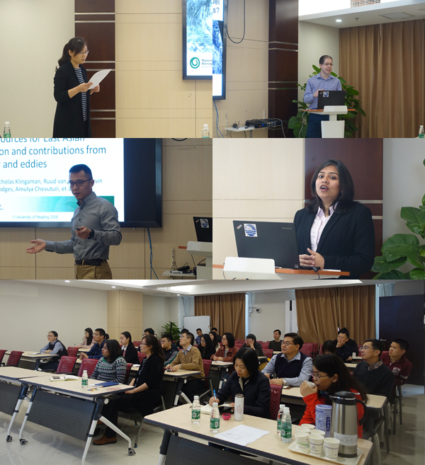 与会专家围绕东亚降水的水汽源地追踪、季风降水的模拟及预估、青藏高原涡及对应降水的变化规律等,交流了相关研究进展。雷丁大学Nicholas Klingaman博士、Guo Liang博士和Amulya Chevuturi博士分别做了季风区气候变率的过程评估方法、基于WAM模式的亚洲降水水汽源地追踪和英国一体化模式预估结果等方面的报告,大气所专家重点介绍了基于拉格朗日方法的亚洲降水水汽追踪、季风区降水年循环的未来变化、分辨率对气候预估的影响、FGOALS-f2模式进展及其对热带气旋和海冰模拟性能等方面的进展。与会人员就不同水汽追踪方法的优缺点,分辨率对季风模拟影响及季风预估不确定性等开展了热烈的讨论。