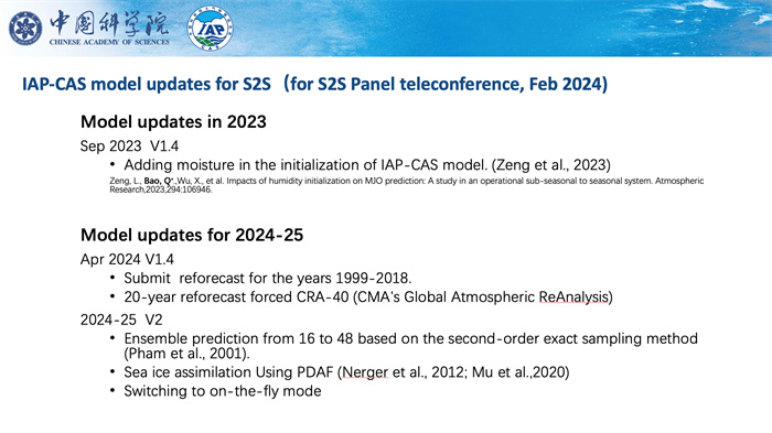 随后,各个模式中心分别汇报了2023年进展及2024-2025年预测系统更新计划。包庆研究员代表大气所团队介绍了IAP-CAS预测模式在2023年更新进展,包括了新的湿度初始化方法和完成了16集合的20年历史回算,新回算中MJO预报技巧达到了30天;IAP-CAS预测2024-2025年计划改进预报系统集合方法,增加海冰同化,并且将采用实时动态回算模式(On-the-fly mode)运行。与会专家纷纷对IAP-CAS升级给予肯定,并对大气所预测系统的未来充满了期待。