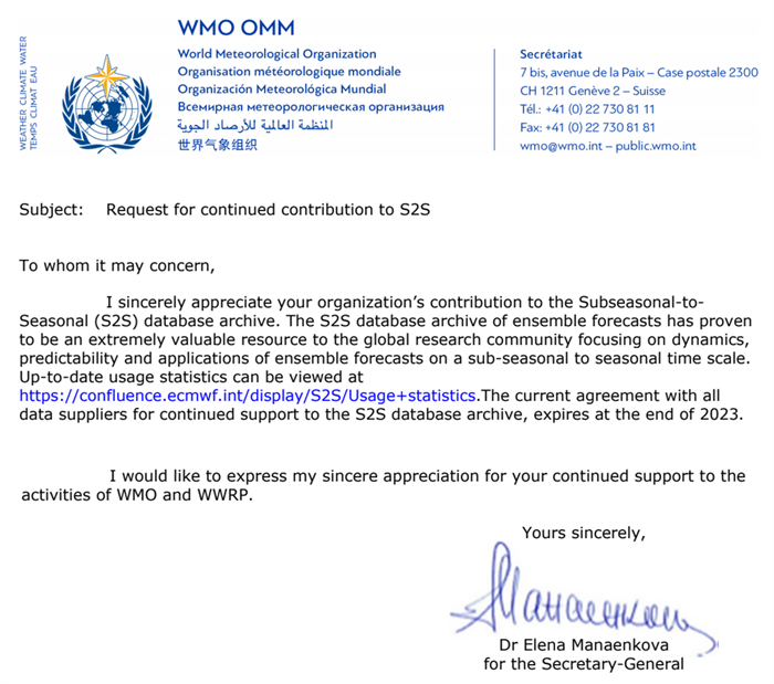 7月20日,中国科学院大气物理研究所收到了一封来自世界气象组织(WMO)秘书长发来的感谢信,世界气象组织副秘书长Elena Manaenkova博士代表秘书长肯定了中国科学院大气所提供的次季节-季节(S2S)预报产品的贡献,表示“S2S数据集的预报已经成为全球研究机构关注动力学、可预测性以及集合预报在次季节到季节时间尺度上的应用的极为宝贵的资源”,并“真诚地感谢贵机构对次季节-季节数据库的贡献”,“我衷心感谢你们继续支持世界气象组织(WMO)和世界天气研究计划(WWRP)的活动”。