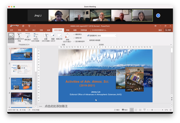 AAS国际合作主管林征在国际IAMAS执行局线上会议上介绍了期刊2019-2021年的出版活动。2019年7月在蒙特利尔的IAMAS执行局会议上AAS和IAMAS成功续约之后,AAS与国际IAMAS共同组织南极气候与气象专刊 (https://link.springer.com/journal/376/volumes-and-issues/37-5)。IAMAS执行局委员认为AAS发展态势良好,将在AAS网站和Newsletter等平台突出显示AAS的成绩,并动员IAMAS科学家给AAS投稿,并参与组织专刊,同时考虑到目前有众多掠夺性期刊混乱学术出版格局,建议AAS应继续保持严格和独立审稿。