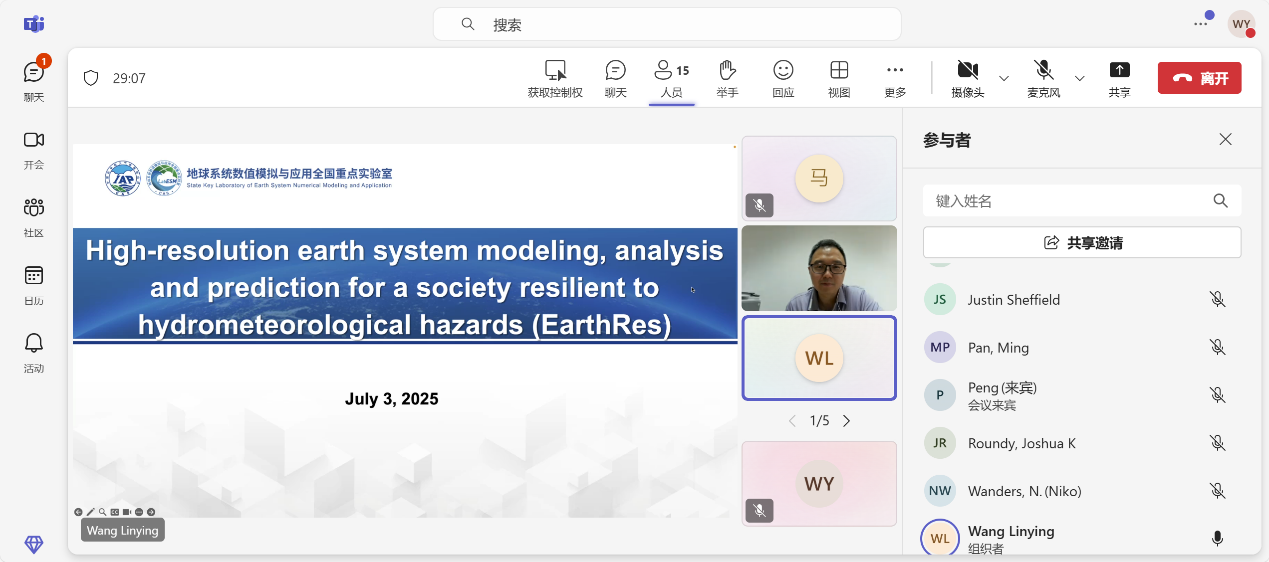 2025年7月3日,EarthRes计划线上启动会顺利召开。合作团队英国南安普顿大学Justin Sheffield教授,美国加州大学圣地亚哥分校Ming Pan研究员,美国堪萨斯大学Joshua Roundy教授,荷兰乌得勒支大学Niko Wanders教授,韩国浦项科技大学Jonghun Kam教授,新加坡国立大学Xiaogang He教授,中国科学院大气物理研究所袁星研究员以及部分年轻骨干参会。会议由EarthRes计划负责人袁星研究员主持,专项办王琳瑛副研究员系统介绍了EarthRes计划背景、目标及合作倡议。研讨交流环节,与会专家一致认为该项目立足国际前沿,在科学目标设定和国际合作机制等方面展现出突出的创新性和实践价值。在具体实施层面,合作团队达成了三点重要共识:一是要建立标准化、开放性的国际数据共享平台,实现多源观测数据与高分辨率模型输出的高效整合与共享;二是要创新协作机制,通过定期学术交流、联合攻关等方式,充分整合全球优质科研资源,突破水文气象灾害领域的前沿科学与技术问题;三是要明确阶段性目标,确保计划有序推进。这些共识为构建国际领先的灾害预警研究平台奠定了坚实基础,将有力推动计划的顺利实施。