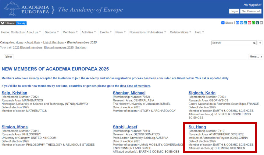 近日,欧洲科学院(Academia Europaea)陆续公布2025年院士入选名单,经评审,中国科学院大气物理研究所苏杭研究员当选欧洲科学院院士(MAE)。