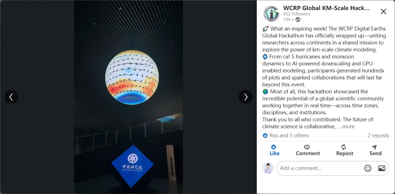 此外,本次北京节点的活动受到了社会各界的广泛关注。开幕式当天,央视新闻、中国新闻网、中国环境报、北京日报、科学网等多家媒体纷纷进行了报道。活动期间,Xinhua News App、China Xinhua Sci-Tech(Facebook)、China Xinhua Sci-Tech(X)、Advances in Atmospheric Sciences(Facebook)、Advances in Atmospheric Sciences(LinkedIn)等海外社媒账号也进行了跟踪报道。此外,北京节点通过LinkedIn积极更新每日动态与进展,受到WCRP Global KM-Scale Hackathon 2025官方账号点赞与转发,团队成果亦实现了“地球模拟实验室”可视化球屏的即时显示,被官方账号列为全球闭幕亮点报道。