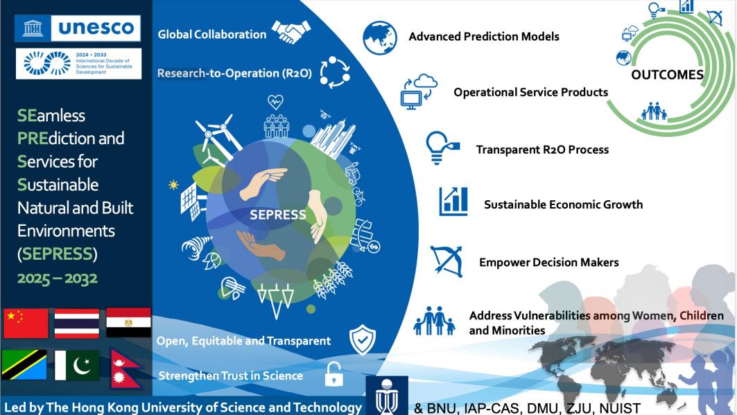 该国际计划由香港科技大学牵头,与中国科学院大气物理研究所、北京师范大学、浙江大学、大连海事大学、南京信息工程大学等国内高校和科研院所携手合作,并联合坦桑尼亚、尼泊尔、不丹、泰国、埃及和巴基斯坦等国家的机构共同发起。该计划旨在通过先进而可靠的天气-气候无缝隙预测,实现科学研究与实际应用的紧密结合,推动全球自然与人为环境的可持续发展。在未来八年里(2025-2032),SEPRESS计划不仅将主动发起和牵头关键项目,还将通过支持和认可其它符合联合国可持续发展目标(Sustainable Development Goals,简称SDGs)的项目,积极推动全球气候韧性建设与可持续发展,逐步掌握国际科学合作领域的话语权,成为全球“从研究到应用(Research-to-Operations,R2O)”转化机制中的重要倡导者与领导者。SEPRESS计划将强化我国在可持续发展领域的领导地位,为国际社会应对气候变化、自然灾害及其它全球性挑战提供科学指导和创新解决方案。该计划紧密对接SDGs,重点聚焦水资源管理、粮食安全、清洁能源、气候行动、人类健康、经济发展、防灾减灾等七大关键领域,将为全球可持续发展提供强有力的科学支撑。