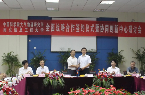 2012年8月29日至31日,由王会军所长带队,大气所陈洪滨副书记、朱江副所长、程新金副所长以及部分职能部门处长和研究室主任等一行十二人赴南京,与南京信息工程大学签署全面战略合作协议,并参加“气象灾害预警预报与评估”协同创新中心签约揭牌仪式及“协同创新中心”研讨会。