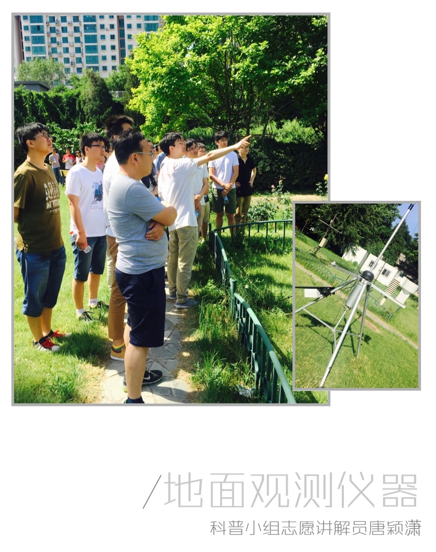 同学们先由科普小组志愿讲解员唐颖潇(2012级硕博)带领,参观了325米高的气象观测塔,以及地面观测站的设备仪器,并在展板区学习了雾霾与全球气候变化等方面的知识。