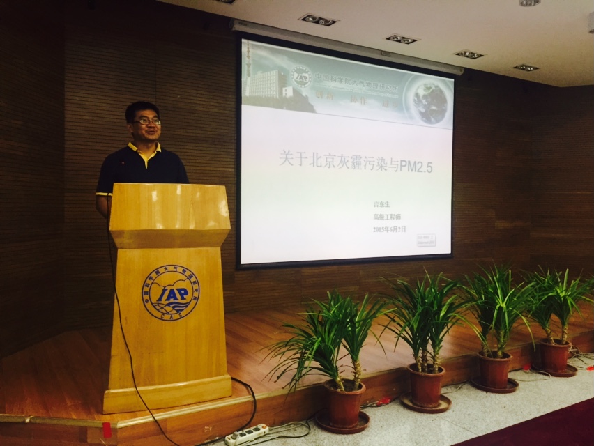 然后同学们来到所本部101会议室,由大气分中心的吉东生高工给大家做了一场生动的雾霾科普讲座。吉老师幽默的语言和与生俱来的东北腔引发了同学们的阵阵笑声。报告之后,同学们还结合最近热点新闻问了许多问题,比如“北京出台了严厉的控烟禁令,吸烟是否对PM2.5有很大贡献?”“柴静的《穹顶之下》里的数据是否有问题?”等等,吉老师一一予以解答。