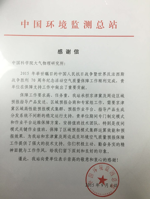 我所在中国人民抗日战争暨世界反法西斯战争胜利70周年纪念活动空气质量保障工作中做出了重要贡献,中国环境监测总站特发来感谢信。