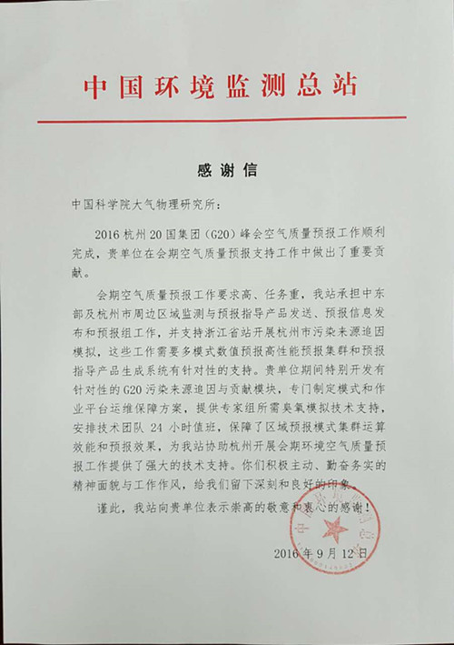 中国环境监测总站特发来感谢信,感谢我所在2016杭州20国集团(G20)峰会期间在空气质量预报工作中所做的重要贡献。
