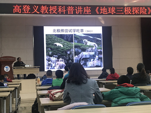 高登义研究员以南极、北极、青藏高原适者生存的北极熊、冰山雪岩、北极雪绒花等一系列精美的图片,生动、有趣地分享了他走遍“三极”的经历,特别是北极熊面对困难时是如何改变自己求生存的,适应变化应该成为每一个人的终身发展本领。他让现场的所有听众与他共同朗读了达尔文说的话:“能够生存下来的物种,并不是那些最强壮的,也不是那学最聪明的,而是那些对变化做出快速反应的。在科普演讲座中,他还讲述了老一代科学家为科学事业奉献一生的精神。