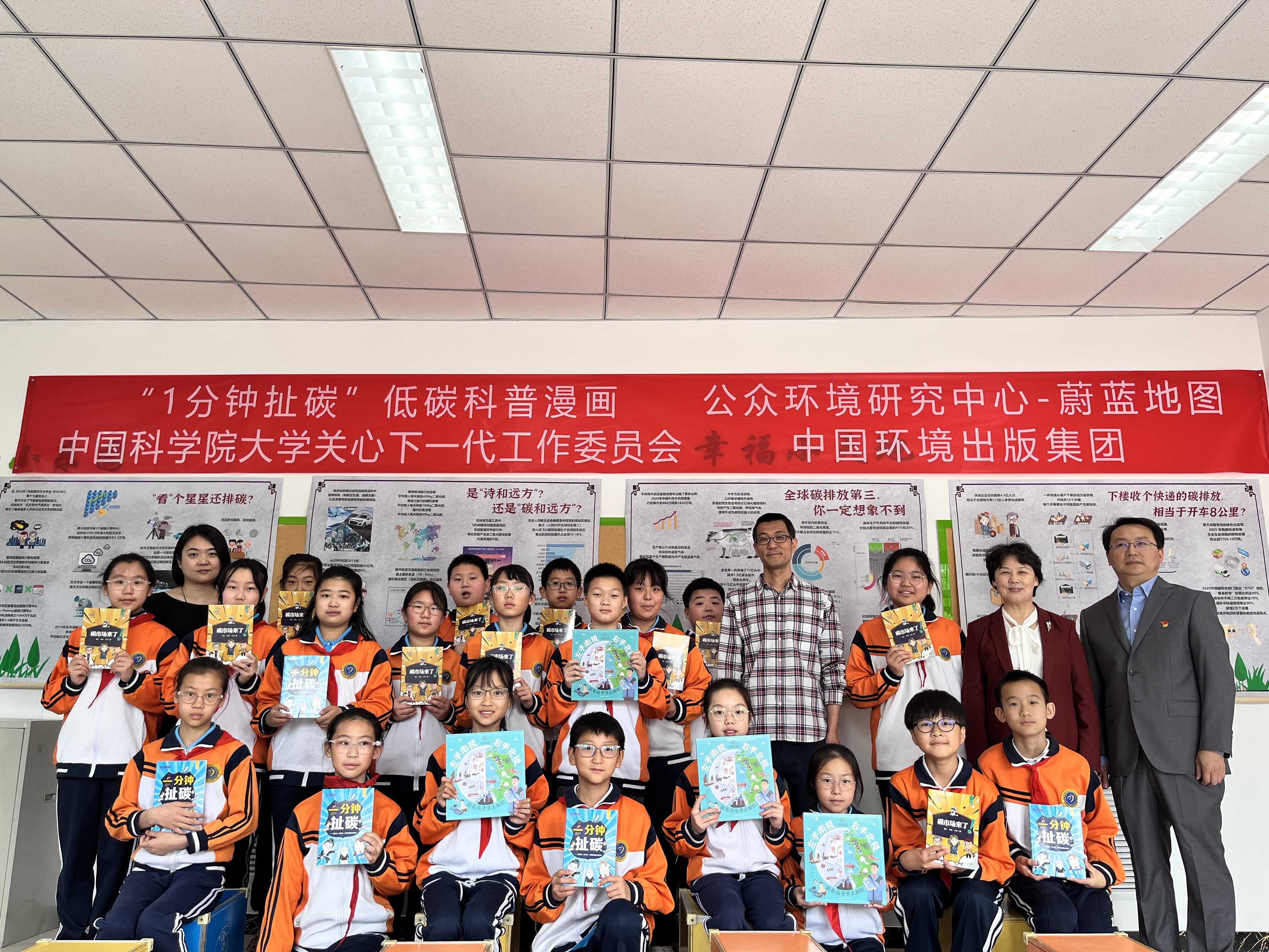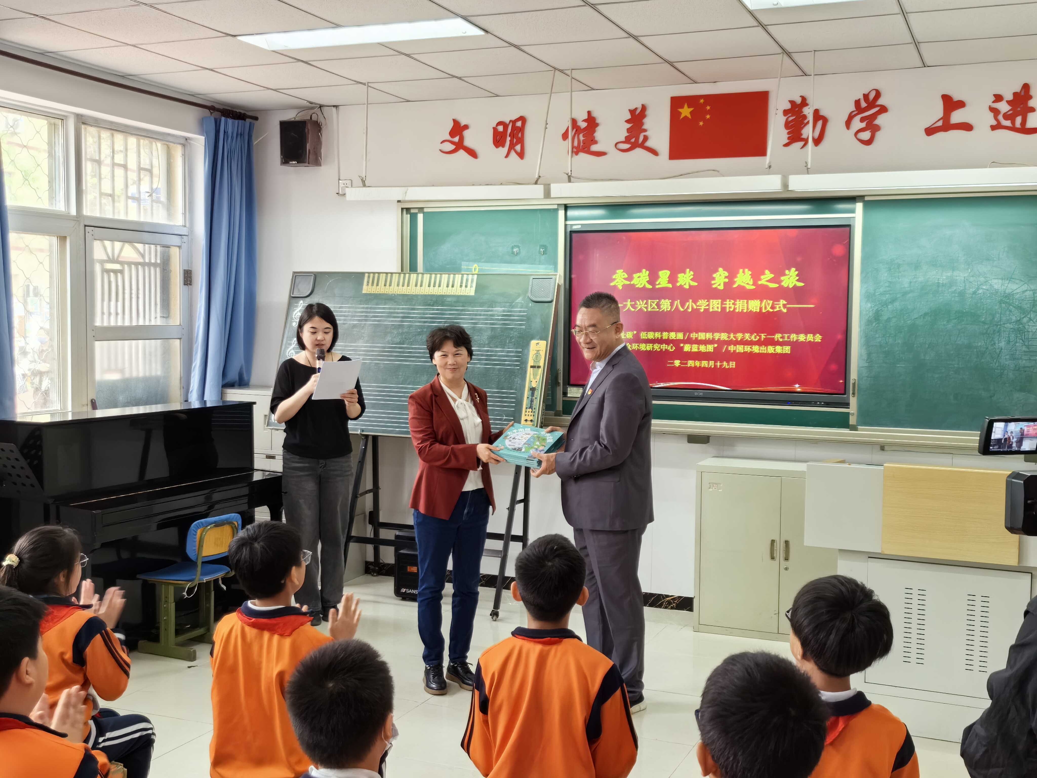 首先是赠书活动,生态环境部环境规划院碳达峰碳中和研究中心主任蔡博峰研究员、中国科学院大学关心下一代工作委员会副秘书长刘荣华老师、中国环境出版集团科普专员梅霞老师分别向北京市大兴区第八小学捐赠《碳市场来了》、《碳中和时代生存手册》、《左手南极 右手北极》等科普图书,希望八小的同学们能通过阅读碳中和相关科普书籍,开阔视野、拓展思路、增长知识。