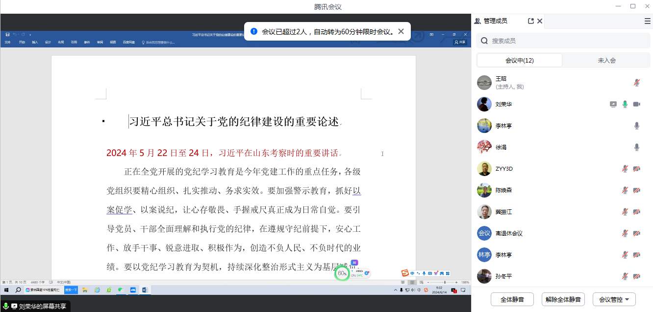 2024年6月14日上午,离退休党总支召开(线上)扩大会议,总支副书记王昭主持会议。
