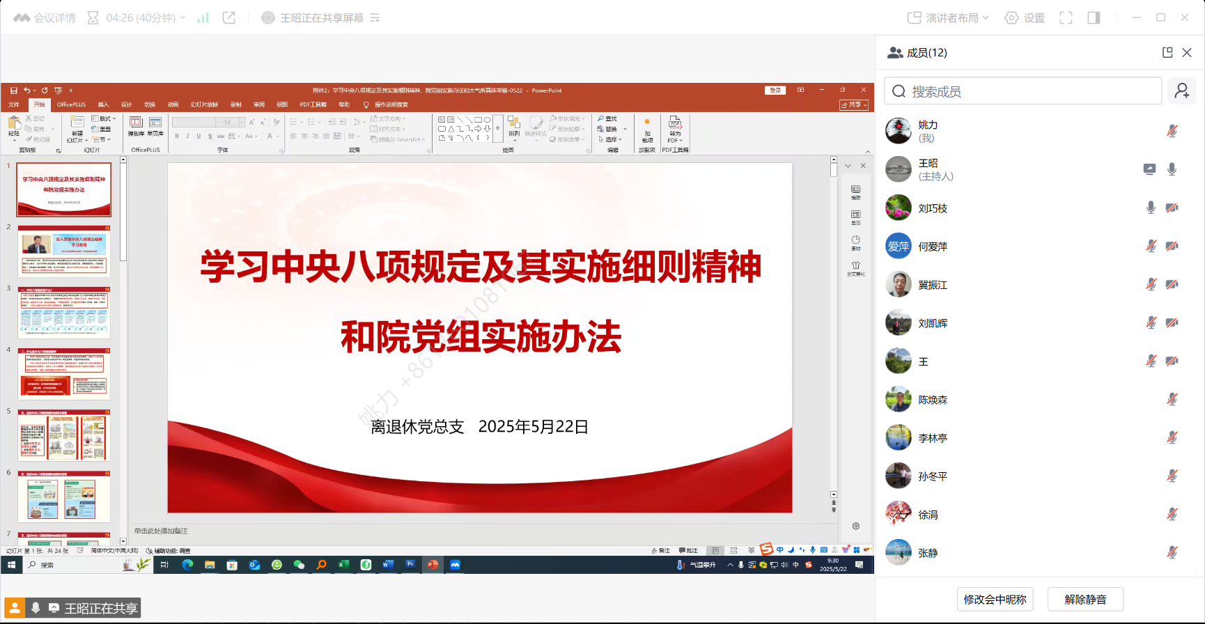 2025年5月22日上午,离退休党总支召开(线上)扩大会议,各支部委员参会,党总支副书记王昭主持会议。