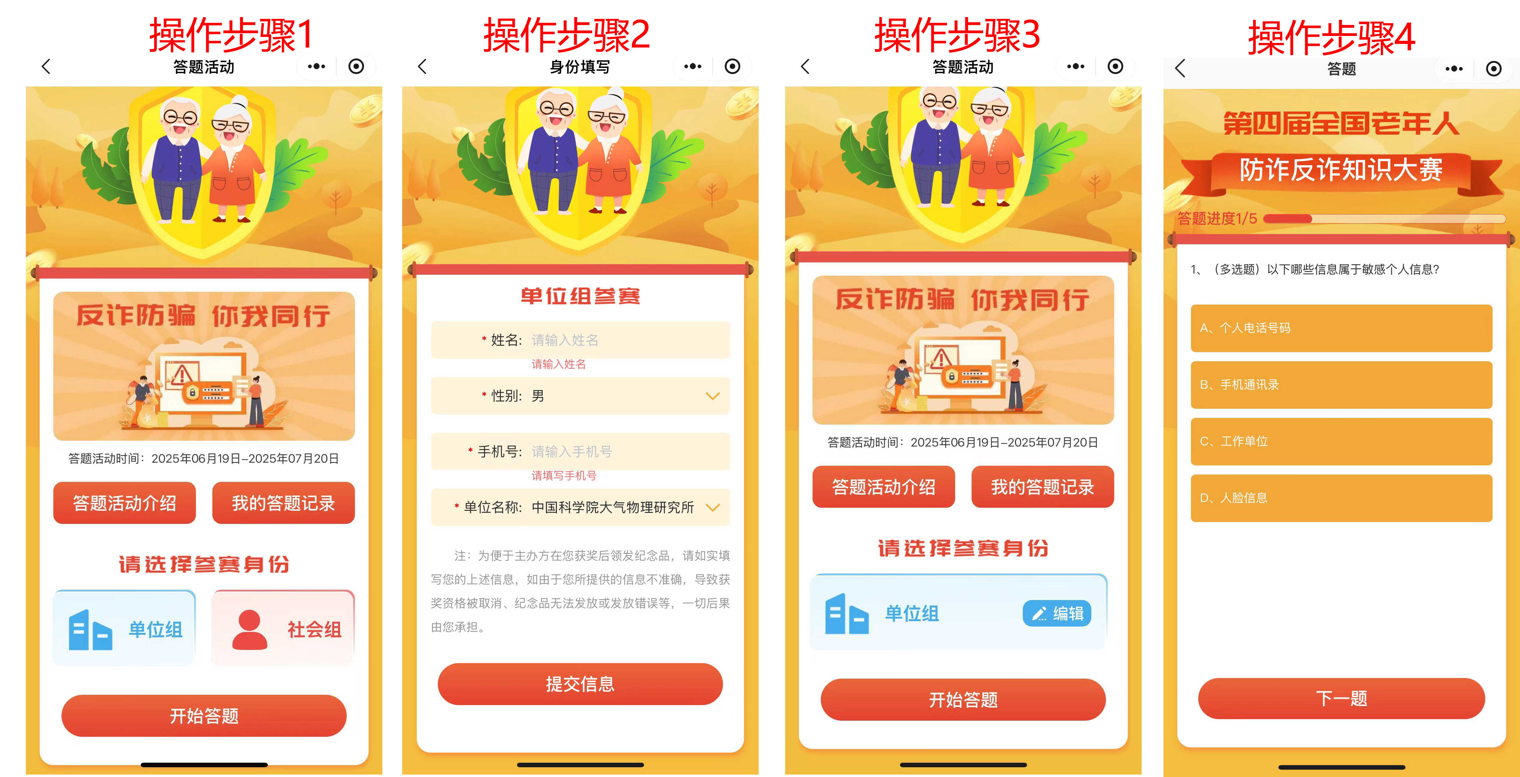 进入“中国老年”页面后,点击页面下方的“活动”,选择蓝色图标“单位组”;填写真实姓名及单位信息后,点击“提交信息”跳转至新页面,点击“开始答题”进入答题环节。答题形式包括单选、多选和判断题。答题竞赛期间,每天均可答题一次,大赛期间多次答题的,以分数高、用时短的成绩为准。授予答题成绩优秀者成为“防诈反诈宣传员”。(离退办)