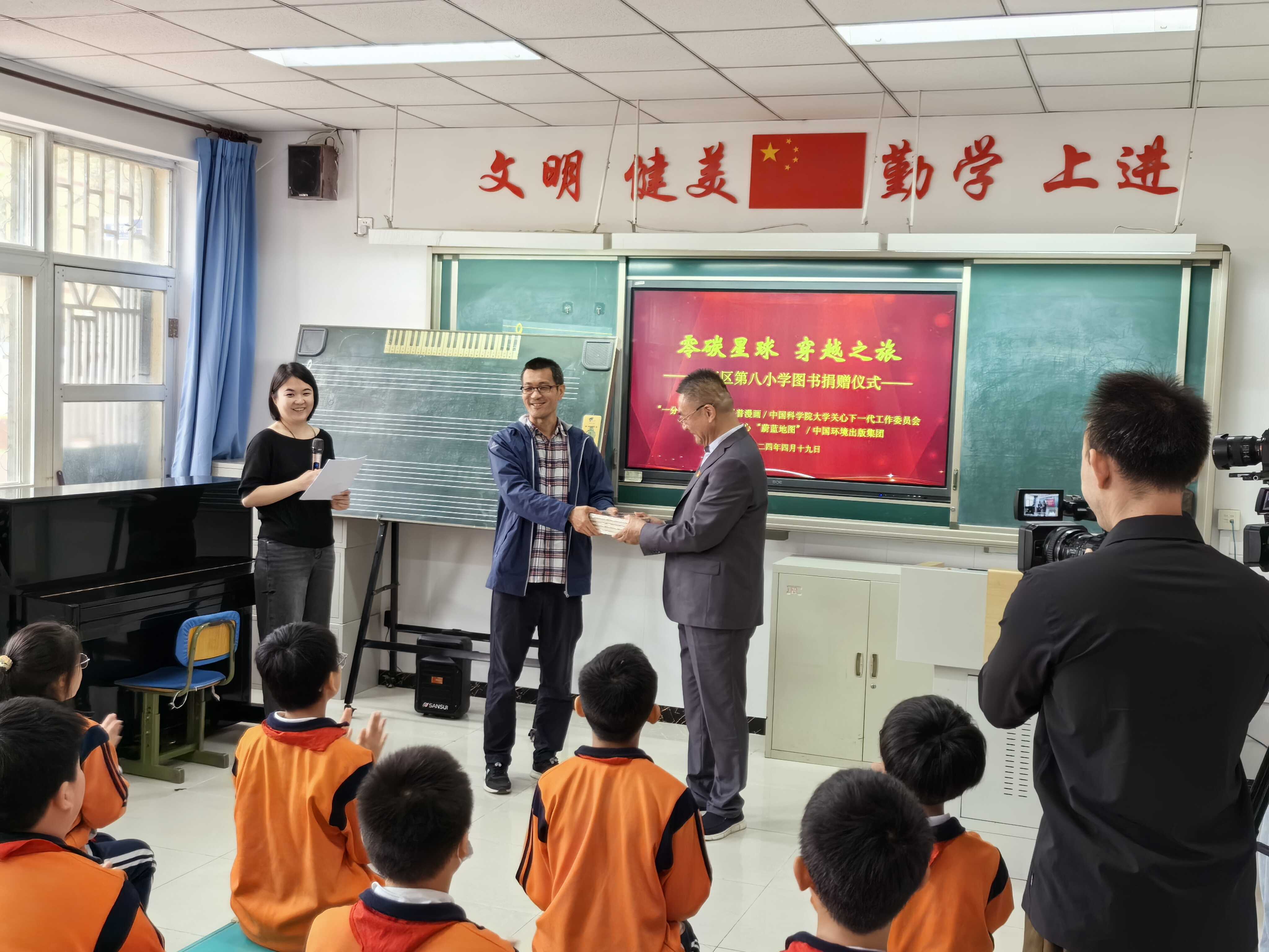 首先是赠书活动,生态环境部环境规划院碳达峰碳中和研究中心主任蔡博峰研究员、中国科学院大学关心下一代工作委员会副秘书长刘荣华老师、中国环境出版集团科普专员梅霞老师分别向北京市大兴区第八小学捐赠《碳市场来了》、《碳中和时代生存手册》、《左手南极 右手北极》等科普图书,希望八小的同学们能通过阅读碳中和相关科普书籍,开阔视野、拓展思路、增长知识。