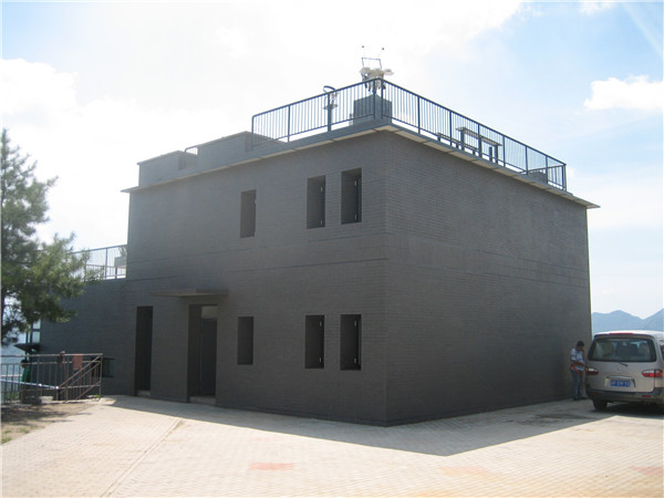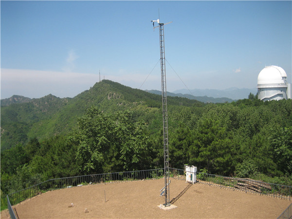 图1:兴隆大气本底观测站观测楼。楼内包括大气辐射观测平台、大气气溶胶光学特性、大气温室气体和大气污染气体成分、以及雷电特性综合观测仪器。观测楼位于海拔960米的山顶悬崖处,周边群山环绕,人烟稀少,人类活动相对较弱。