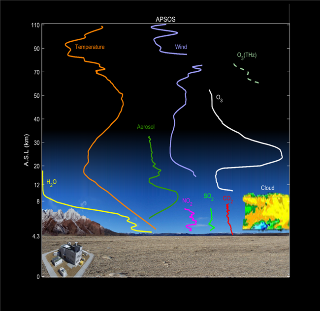 羊八井全大气层观象台部署的APSOS(多波段多大气成分主被动综合探测)系统,采用主被动遥感相结合的方式,涵盖从紫外到红外、从太赫兹到毫米波的探测波段,探测对象包括:大气温室气体、大气污染气体、大气温度、湿度和风场、气溶胶、卷云和非降水云等。该探测系统的各核心单元在技术开发上自成体系,在数据反演方面相互配合,该系统大幅提升了我国在大气环境探测方面的综合国力和技术水平,为大气环境监测、灾害预报和科学研究提供有价值的原始数据,有助于对大气中新过程、新现象的发现和理解。