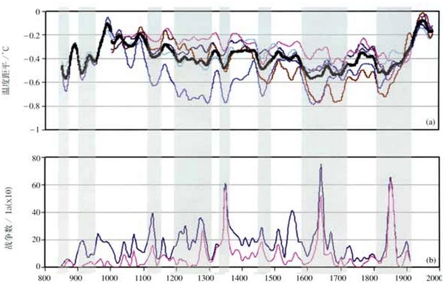 图a是公元850-1980年北半球20°N以上的陆地温度距平,不同颜色代表着不同数据资料,黑色粗实线是资料平均。图b是同一时期的战争数,蓝色代表总频率,浅红代表反叛战争的频率。图中阴影部分代表的是冷期,其定义是温度距平低于-0.35°C。