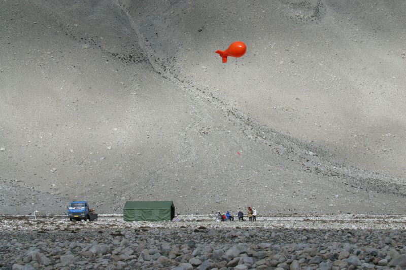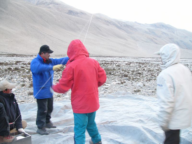 此次珠峰监测我们首次利用TMT系留气艇对珠峰地区地面以上1 km以内的大气进行观测,获得了更加详细的近地层资料。珠峰河谷地区下午盛行下山风,风速有时甚至达到20 m/s,以前由于缺乏仪器我们几乎没有在下午进行过观测。此次为获得完整的珠峰河谷地区大气环境日变化资料,我们决定进行连续的观测:风速在10 m/s以下时用TMT探空观测,大于10 m/s时用GPS探空气球观测。事实并非想象的简单:1)由于高海拔下低气压的影响,TMT系留气艇的绞车第一天电容被烧!2)由于午后珠峰河谷风大,释放的GPS探空气球低层信号时断时续!为解决这两个困难,全队召开会议,共同商讨对策。大卡车司机提出能否用备用轮胎的胎盘代替绞车,只要将绞车线缠绕在胎盘上,发动汽车,前进可以放线,后退可以收线。实验结果证明这个"土"办法完全行得通,就是每次放飞气艇时汽车尾气薰得大家难受。GPS探空在大风时也很不稳定,为此我们决定重复施放,力争获得珠峰河谷地区的日变化过程。从6月7日到6月9日,我们成功获得了一个日变化全过程和不同时段的TMT及GPS探空资料。回想这些资料的取得其代价也是巨大的,这其中包括我们损失了一个TMT气艇,摔坏了两个及损失了一个TMT探空仪,因为GPS探空仪信号不稳定损失的两个GPS探空仪及探空气球。整个考察队在这几天轮流休息,全天值班,在这么高海拔的地区辛苦程度可想而知。目前该资料正在整理分析中。CCTV对此次观测行动进行了跟踪报导,共播出新闻7条,其中晚间新闻联播播出2条。