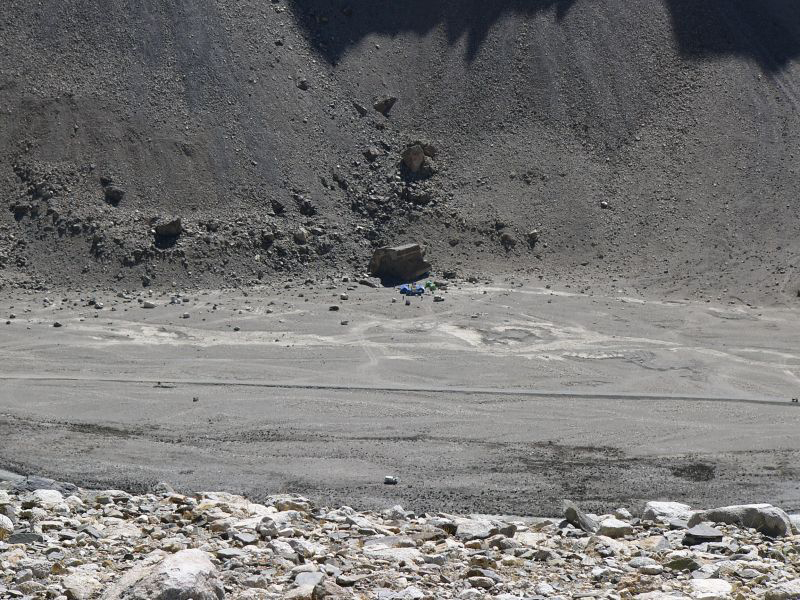 本次观测除了常规的气样、水样收集以及GPS探空观测外,我们同样要进行地面自动气象站的观测。由于我们此次研究集中在近地层及对流层,对三台地面自动气象站的资料要求格外关注。由于前两次考察中三台地面自动气象站架设高差小,数据分析难度较大,此次考察队决定将其中一台地面自动气象站架设在珠峰绒布河对面的山上,形成与珠峰河谷较大的高差,也是对特殊的珠峰河谷地形形成的特定河流进行监测。由于两年前我曾经爬到珠峰山上进行建站工作,队里决定还由我带队穿越绒布河架设自动气象站。建站最大的困难主要来自于穿过绒布河水。此时临近初夏,绒布河水(为珠峰融化的雪水)很急很宽。6月6日凌晨,我和学生小马及另外两个藏族同胞一起向河谷对面的山上前进,想赶在河水小时过河。然而河水还是很深,我们只能得脱下鞋子和裤子趟水过河。清晨的绒布河水特凉,冻得我和小马的腿脚都麻木了,衬裤也全湿了。上岸后赶紧脱了衬裤,换上了毛裤继续前进。我们须尽快返回,否则河水大时人很难穿过。走了几公里路后,我们沿一条"山谷"路线向山上爬行。山路陡峭处走几步人就气喘得不行,呼吸也很困难。走了近两个小时后总算到达我们预定的山顶(其实也不过爬了400米左右,此时海拔5380米),我开始架设第三台MAWS。一个小时后(13:00左右),我们开始下山。半个小时后我们又回到了河谷,寻找可以穿越绒布河的地点。和凌晨相比,午后的绒布河水更急,河面更宽,根本找不到小水的地方。和营地联系后等待营地救援,半小时营地的车终于找到我们,但车也没办法下水。没办法只能靠自己,最后我们选了一处看似较为浅的地方下水。由于河水很宽很急,我要求大家手拉手一起下水,任何情况都不得松手。脱得只剩下小裤头后,大家都冻得不行,赶紧下水。河水真凉,4个人磕磕绊绊地相扶过河。河水真深,我们的裤头都湿了。河水真急,有几次险些滑倒!在我的腿脚都快麻木的时候我们终于趟过了河水到了对岸,其实前后时间也不过5分钟左右!上岸后一个个冻得到处跑。半小时后我们终于回到了营地。回营后才发现自己的脚被河里的石头磨破了,磕青了,赶紧用热水泡了一下,敷上药膏。经历了这次"探险",我们完成了实验的目的,而我又多了些人生的体验。