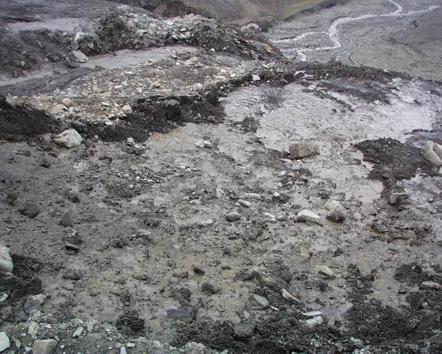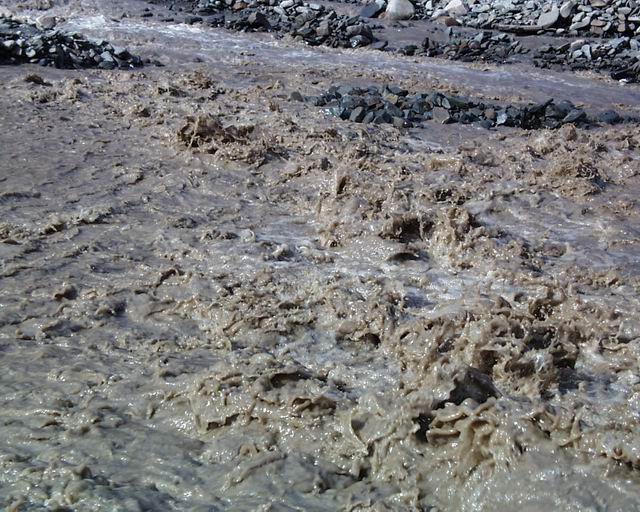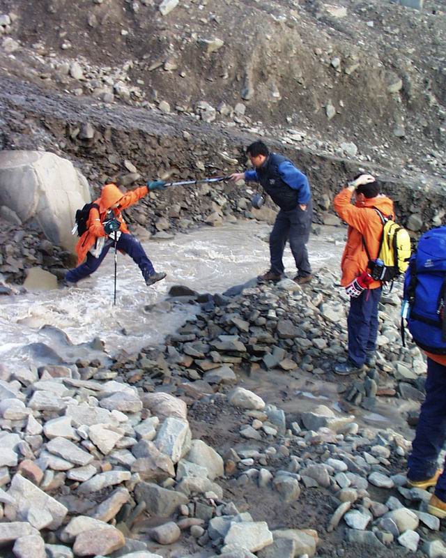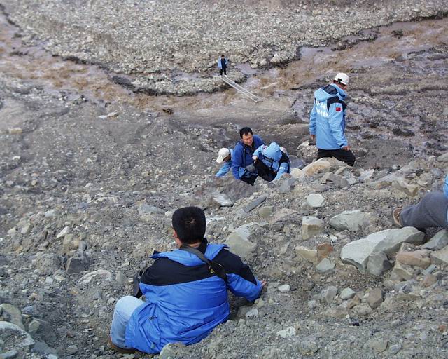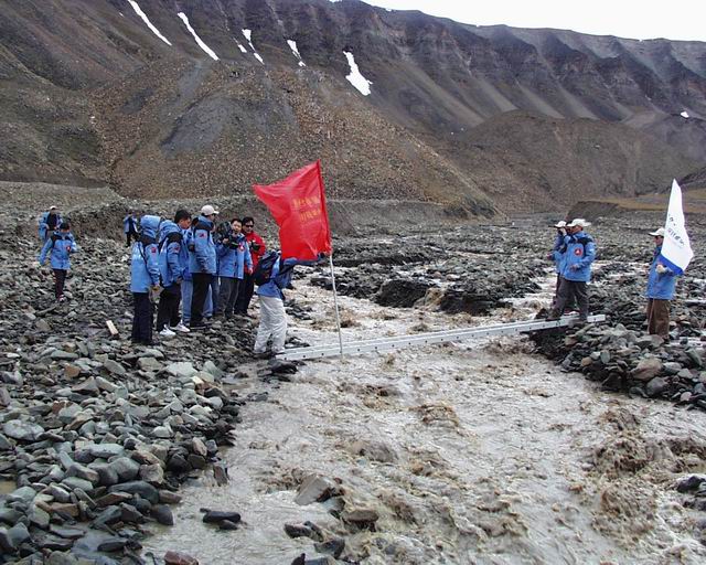 "四渡赤水" 由于目的地在一条宽阔的河谷对岸,必须先渡河。冰冷的冰川融水夹带着泥沙在近3千米宽的河谷中冲刷出四条较大的河流,我们必须乘橡皮船通过。储国强把他用于湖中采样的橡皮船作为过河之用。橡皮船只能载2-3人,在湍急的河水中很难用桨划行,我们打算用长绳拖拉,关键必须有人先把橡皮船划到对岸,然后才能借助长绳的帮助把橡皮船拖过河,以此方法分批载人。试了三次后,储国强和我终于首次成功地把橡皮船划过去了。浑浊的河水宛赤水",当我们渡过这四条河后,有人即兴地戏称为"四渡赤水"。