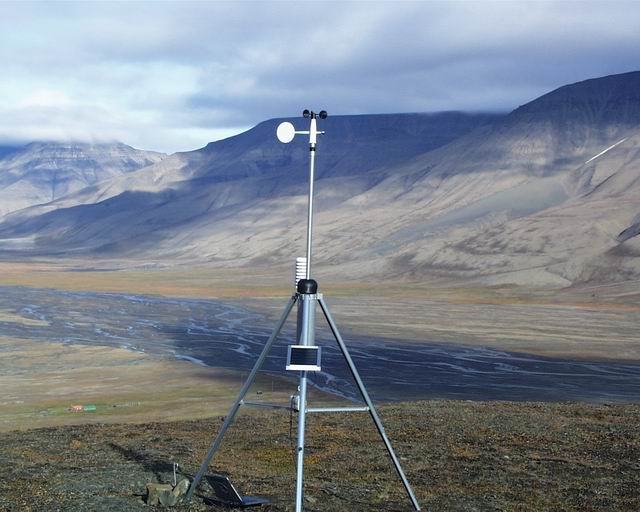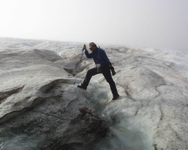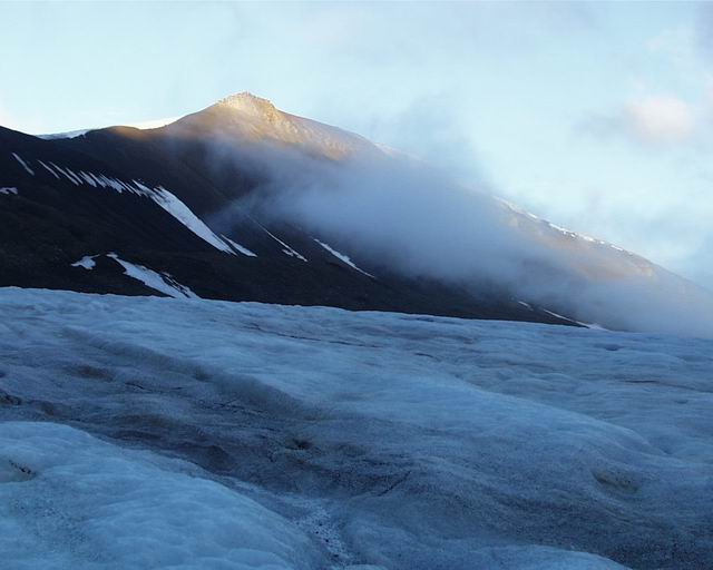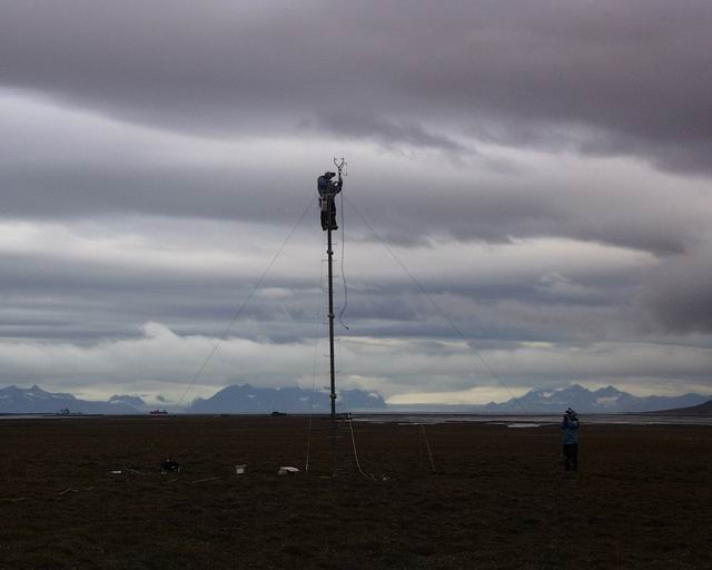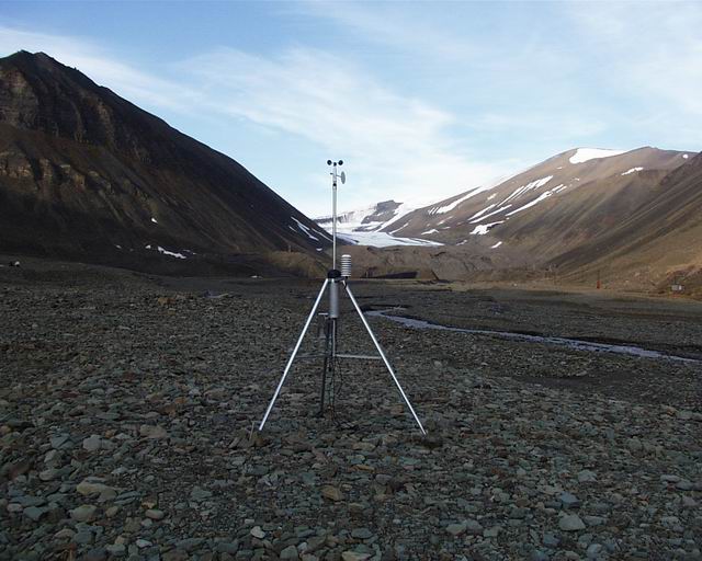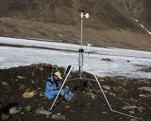 大气组认真选择观测点 中央电视台、湖南电视台的记者们抓紧时机,拍摄奇特的北极风光;人民日报社的副总编李仁臣先生用他的高级数码相机抓拍着……时值夏季,冰川消融非常强烈,冰川表面上几乎每隔5米左右便有一条明河。据张文敬教授说,他粗略测量冰川融水径流大约有1.5个流量(即每秒钟有1.5立方米的冰川融水量)。根据大气边界层观测的基本要求之一:山谷宽度至少应为气象观测塔的高度的100倍,观测站应建在冰川的上部粒雪盆地区(即补给冰川降雪的结累区)。我和大气组科学家反覆对比了1号冰川及临近冰川的观测条件,待到下山时己是当地时间夜里9点过了。和我同行的最后一批下山队员中有朱彤教授以及中央电视台、湖南电视台、广州信息时报记者共10名。当我们下到有公路处时,王维己开车来接我们,累得走不动了的中央电视台的孙树文女士上了汽车时说王维"真是及时雨",逗得大家都笑了。