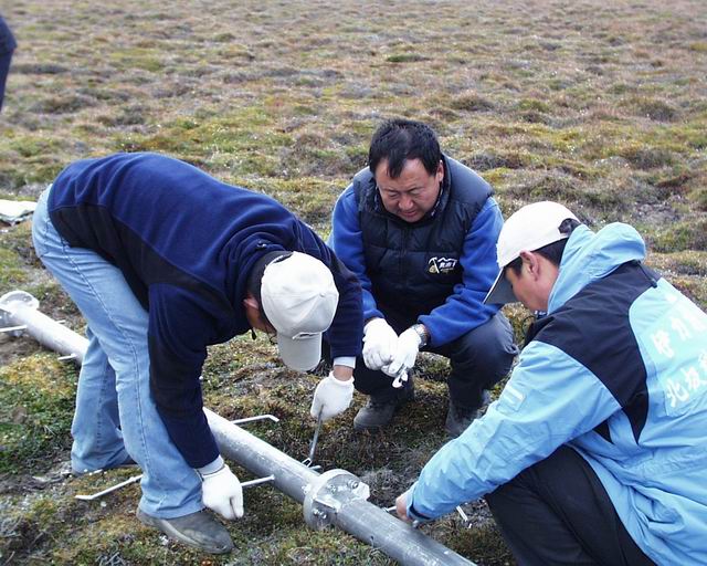 今天,大气组队员继续建站。陆龙骅教授负责建立太阳辐射平衡观测系统,朱彤和曾爱民负责一系列大气边界层物质交换系统,罗卫东、冯克宏负责安装8米高的气象塔,上有两台超声测风仪。近1吨重的观测仪器要从住地搬到观测场并安装起来开展正常观测,需要认真调试,一般需要2-3天时间。
