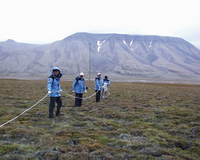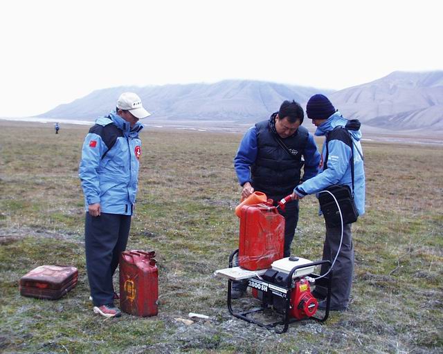 地质组艰苦钻取湖芯 今晨,在刘嘉麒研究员率领下,地质组一行近10人浩浩荡荡奔向采集湖芯的某湖区。大气组刘宇前去协助工作,扛着沉重的金属管,背着数码摄像机,俨然"全副武装"。人民日报社杨健和湖南电视台聂玫、辛艳、倪建新,广州信息时报肖柏青等随同采访。据刘嘉麒告诉我,这是他们组艰苦工作的一天,也许往返需要13个小时以上。天空阴雨绵绵,山上一定寒冷,队友们辛苦了。幸好风不大,不会带来风浪危险。记者们于下午四时许返回,刘嘉麒、储国强和刘宇等于下午九时后回来。大气组举行"晚宴",邀请地质组赴宴,四菜一汤,红酒一瓶,一为庆祝大气组各项观测正常运转,二为地质组开钻告捷:这是世界地质学家在北极斯瓦尔巴德地区湖面上打的第一钻。