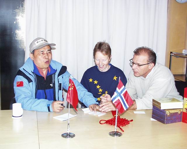 赠送中国国旗 下午6时,我和陶宝祥、武素功、杨永平、王维、刘宇、马健龙、孙丹平以及中央电视台的唐卫东、江帆等前去Huset(House)饭店赠送中国国旗。两位饭店老板在其会议室接旗。事情经过是这样。8月8日晚,植物组武素功和杨永平为感谢湖南经济电视台在Huset饭店请客,饭店老板知道这些顾客来自中国,于是主动谈及该饭店将于今年9月25日举办"中国之夜",并将请中国驻挪威大使馆出席,厨师将从大使馆邀请。然而,该饭店没有中国国旗,想从中国人的北极科考队中购买。杨永平机灵地回答说"我们不会卖中国国旗,我想,如果队里有的话,可以送你们一面。"老板听了很高兴,当即赠送小菜两盘,并打8折收费。当我得知此信息后,决定赠送一面中国国旗,扩大中国在北极斯瓦尔巴德地区的影响。中央电视台、北京青年报和天津日报参加了采访。