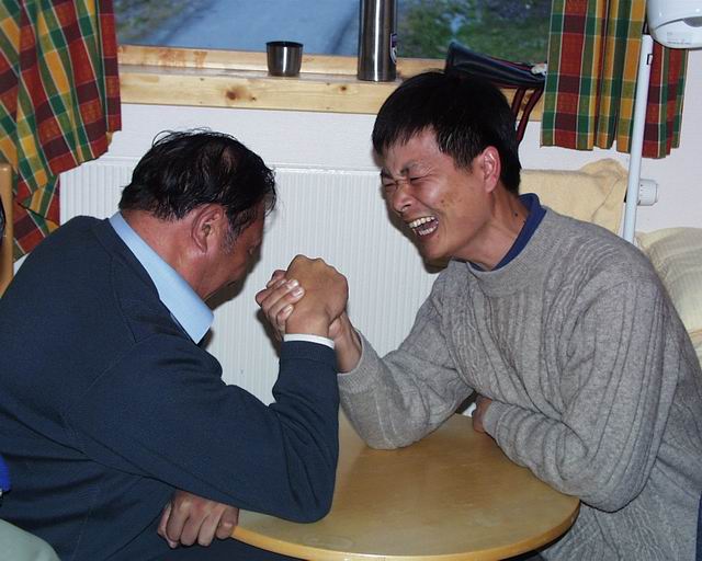 喜从天降 昨晚,我正在写日记,刘宇推门说:"高老师,有客人找您。"两位挪威客人接踵而入。一位非常熟悉的声音对我说Glad to meet you again."我的第一印象是朋友霍尔维克来了,我兴奋地说:"Me too"我迎上前,我们相互拥抱。我的朋友向我介绍了另一位挪威客人,那是UNIS的董事会主席。我们握手寒暄后,我请客人坐下,让刘宇去拿一瓶红酒来招待客人。一瞬间,我想,"霍尔维克原计划是8月20日率领各国驻挪威的大使来朗伊尔宾,为什么提前了?"我问:"How long will you be here?""I will leave here tomorrow.""How many person with you?""Only one.""I heard you have a delegation.""No, tomorrow morning UNIS will have an opening celebration for new students. We will give a short speech."他说到这儿我明白了,这位朋友不是挪威极地大使霍尔维克,而是卑尔根大学校长卡尔*罗曼维特(Kare Rommetveit)。1993年9月,我邀请卡尔和卑尔根大学的另一位校长一同访问中国,我派协会的李涤微博士到中尼边境的樟木口岸去接他们;我们在拉萨相见,我们一起在拉萨相处了四天。在拉萨期间,应他们的请求,中国科学探险协会顾问、西藏自治区常务副主席毛如柏和西藏军区司令员江洪涛分别会见了他们。我们在北京签订了卑尔根大学与中国科学探险协会的科学探险合作协议,这是中挪两国科技界之间的第一个合作协议。从此,中挪两国的科学合作逐渐扩大,中方扩大到中国科学院、北京师范大学、西藏气象局和西藏大学等,挪方扩展到南森遥感和环境研究中心、UNIS等。1996年,我被应邀参加卑尔根大学50周年校庆活动。天长日久,我们之间的友谊日益增进。今日他前来拜访,我喜出望外。由于他与霍尔维克的外貌相似,我差点认错了,好在很快纠正了过来。