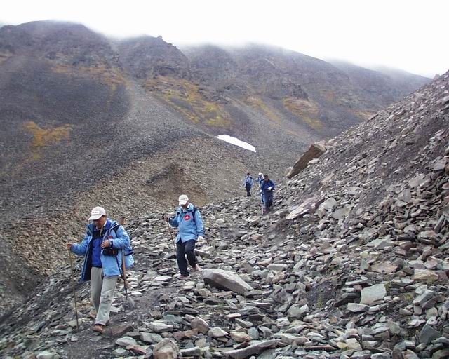 "爬雪山" 在一阵欢笑声中我们开始了"爬雪山"。相对高差900多米的碎石山,平均坡度在30度以上,有几段陡坡的坡度当在50多度,碎石坡难于攀登,一不小心会滑坠。储国强、朱彤和孙丹平等走在前头,我和曾立民因走另一条不同路线而一度与大队失去了联系。为汇合队伍,我们下辙一段后再横切向南,见到了大队伍。在海拔700多米的高度处,我左腿的旧伤突然疼痛,只好让曾立民追赶大队伍,我在原地等候。我估计等两叁个钟头就行了。其时是当地时间下午4点45分。