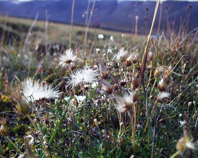 金黄色的路 突然,在我的北侧传来队友们齐声的呼喊,从声音判断,队友下山走了另一条新路,现在快要下到与我相同的高度了。我似乎有了外援,似乎不再孤独了。我向队友们回应了几声后,仔细观察"过草地"的路,发现地形高处生长的草因水供应不足已呈金黄色,地形低处的草因水分供应充足而呈绿色,于是,一条可能不淌水即可通过草地的路在我头脑中诞生了:一条金黄色的希望之路。在山麓,借助斜射的阳光,我拍了两卷北极植物的特写后,心满意足地沿着我选择的一条"金黄色的路"在草地中自由地前进。我边走边拍照在冰山下盛开的洁白雪绒花,绿色的草地,用我的三种像机轮流拍摄……待我走回我们的橡皮船旁边时,我的队友们还在远处的绿色草地中排徊,显然,队友们又陷入了沼泽丛中。