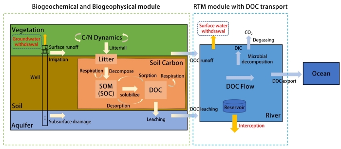 图2:包含河流溶解有机碳(DOC)输送和人为水调节活动的陆面过程模式框架示意图(SOM:土壤有机质;SOC:土壤有机碳;DIC:溶解无机碳)