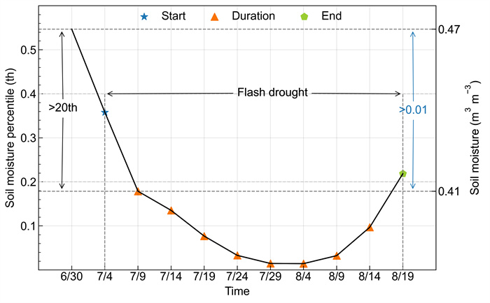 图1 骤发干旱事件示意图。黑色实线表示 2007 年骤发干旱期间一格点(25 N,112 E)上的候平均土壤湿度百分位数。小于40th的第一个点(星号)、大于20th的第一个点(五边形)和两者之间的点(三角形)分别表示骤发干旱事件的开始、结束和持续,蓝色箭头和数值表示绝对土壤湿度变化标准