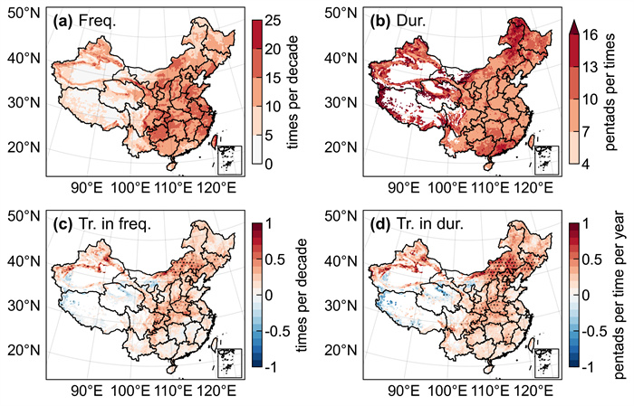图2 1981-2021年中国骤发干旱频率、平均持续时间和其变化趋势的空间分布