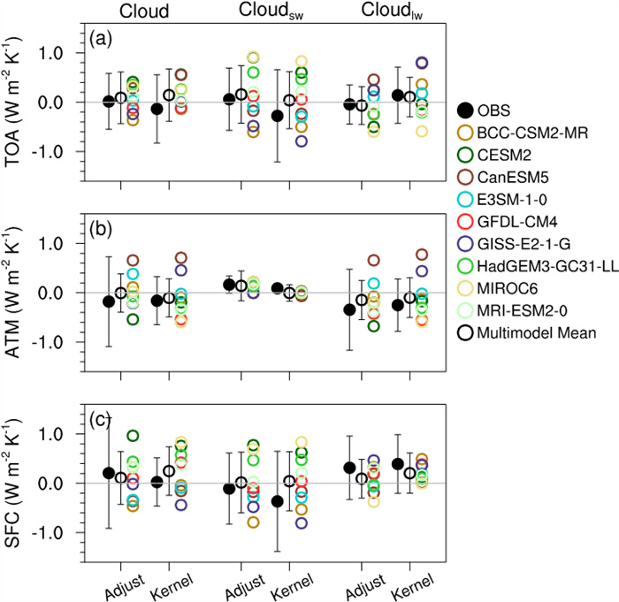 图1. 观测和 AMIP6 模式在大气顶部(a)、大气柱(b)和地表(c)的全球平均云反馈。实心圆圈中的误差条代表观测数据的95%置信区间,空心圆圈中的误差条代表模式的95%置信区间。