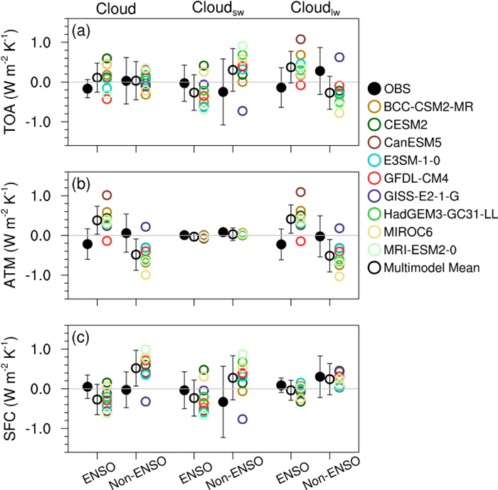 云反馈被认为是气候敏感度最大的不确定性来源。为此,迫切需要利用观测数据来验证气候模式中的云反馈。遗憾的是,由于缺乏长期观测数据,特别是卫星辐射通量测量数据,很难从观测数据中估计长期云反馈。不过,目前观测数据足以用于估算由厄尔尼诺-南方涛动(ENSO)引起的短期云反馈。为此,中国科学院大气物理研究所王晓聪副研究员等,联合南京气象创新研究院科研人员比较了2000-2014年期间观测和AMIP6模式数据在大气顶部(TOA)、大气层(ATM)和地表(SFC)的短期云反馈。