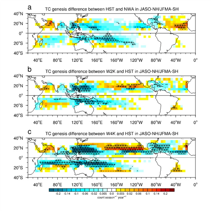 图1. (a)HST和NWA,(b)W2K和HST,和(c)W4K和HST在北半球的JASO和南半球的JFMA季节中热带气旋生成频数的差异。交叉区域表示通过了95%的信度检验。HST为历史模拟,NWA为没有增暖的模拟,W2K为未来增暖2K的模拟,W4K为未来增暖4K的模拟。