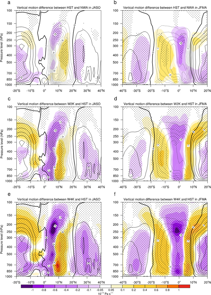 图3. (a-b)HST和NWA,(c-d)W2K和HST,(e-f)W4K和HST在(左)JASO和(右)JFMA季节的纬向平均垂直速度(w,10-2 Pa s-1)的差异。红色阴影中的正值对应于异常下沉运动,紫色阴影中的负值对应于异常上升运动。等值线表示JASO和JFMA季节中HST模式中气候平均的垂直速度(虚线对应于上升运动)。打点区域表示95%的置信水平。