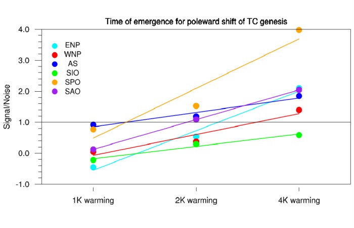 近期中科院大气所季风中心的研究成果基于日本气象厅发布的高分辨率大样本模拟数据集 (d4PDF) 发现,在未来气候变化的背景下全球热带气旋的生成将向两极移动 (图1),在未来增暖4K的模拟中表现最明显。在全球各个海域均显示热带区域热带气旋生成频数的占比随着增暖水平的增加将会降低,而副热带区域热带气旋生成频数的占比随着增暖水平的增加将会增加 (图2),而这主要与Hadley环流的减弱有关 (图3)。随着全球变暖,大气对流层高层的温度增加更快,导致大气稳定度的增加,造成经向环流的减弱,表现为热带区域有异常的下沉运动,使得热带气旋生成频数减少,而副热带区域有异常的上升运动,使得热带气旋生成频数增加。进一步我们发现区域Hadley环流的差异主要与经向的位温梯度有明显的关系。最后利用信噪比方法预估阿拉伯海、南太平洋和南大西洋副热带区域的热带气旋生成的信号将出现在未来增暖2K的背景下,而西北太平洋和东北太平洋副热带区域的热带气旋生成的信号将出现在未来增暖4K的背景下 (图4)。
