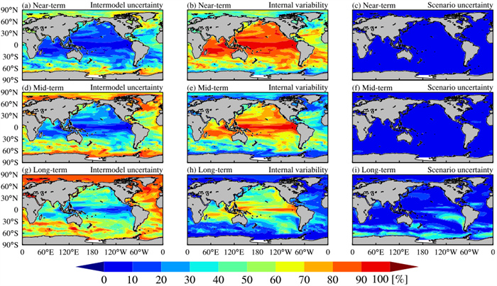 近期,中国科学院大气物理研究所海洋模式团队利用CMIP6集合和FGOALS-g3大样本数据,从海盆尺度和区域尺度探究了DSL预估不确定性的各类来源。研究表明,在海盆尺度上,模式间不确定性是本世纪各海盆DSL预估不确定性的主要来源,在近期(2021-2040)、中期(2041-2060)和远期(2081-2100)的贡献分别达到55%、80%和70%以上。内部变率的贡献在近期(10-42%)和中期(<20%)仅次于模式间不确定性,远期情景不确定性的贡献在除印度洋以外的海盆均超过内部变率的贡献。在区域尺度上,内部变率是近期太平洋、印度洋和大西洋西边界DSL预估不确定性的主要来源(60-100%),而模式间不确定性在其它区域更为重要。从中期到远期,内部变率(模式间不确定性)的贡献在大部分区域减少(增加)。远期,情景不确定性开始在南大洋、太平洋和大西洋变得重要。区域DSL预估的信噪比分析结果表明,直至本世纪末人为DSL变化信号仅能从少数区域涌现。假设模式差异被完全消除,由此得到的perfect CMIP6集合可以提前在更多区域检测到人为DSL变化信号。