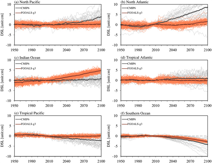 图2 FGOALS-g3超级大样本和CMIP6集合模拟预估海盆平均DSL距平变化(参考态:1995-2014)。(a)北太平洋、(b)北大西洋、(c)印度洋、(d)热带大西洋、(e)热带太平洋和(f)南大洋。灰(橙)线表征CMIP6集合(FGOALS-g3超级大样本)。
