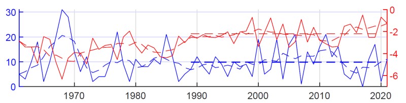 图1. 过去几十年华北冬季气温(红色实线)增加,1989–2021年华北极端冷日数(蓝色实线)先增后减,虚线为5年滑动平均。