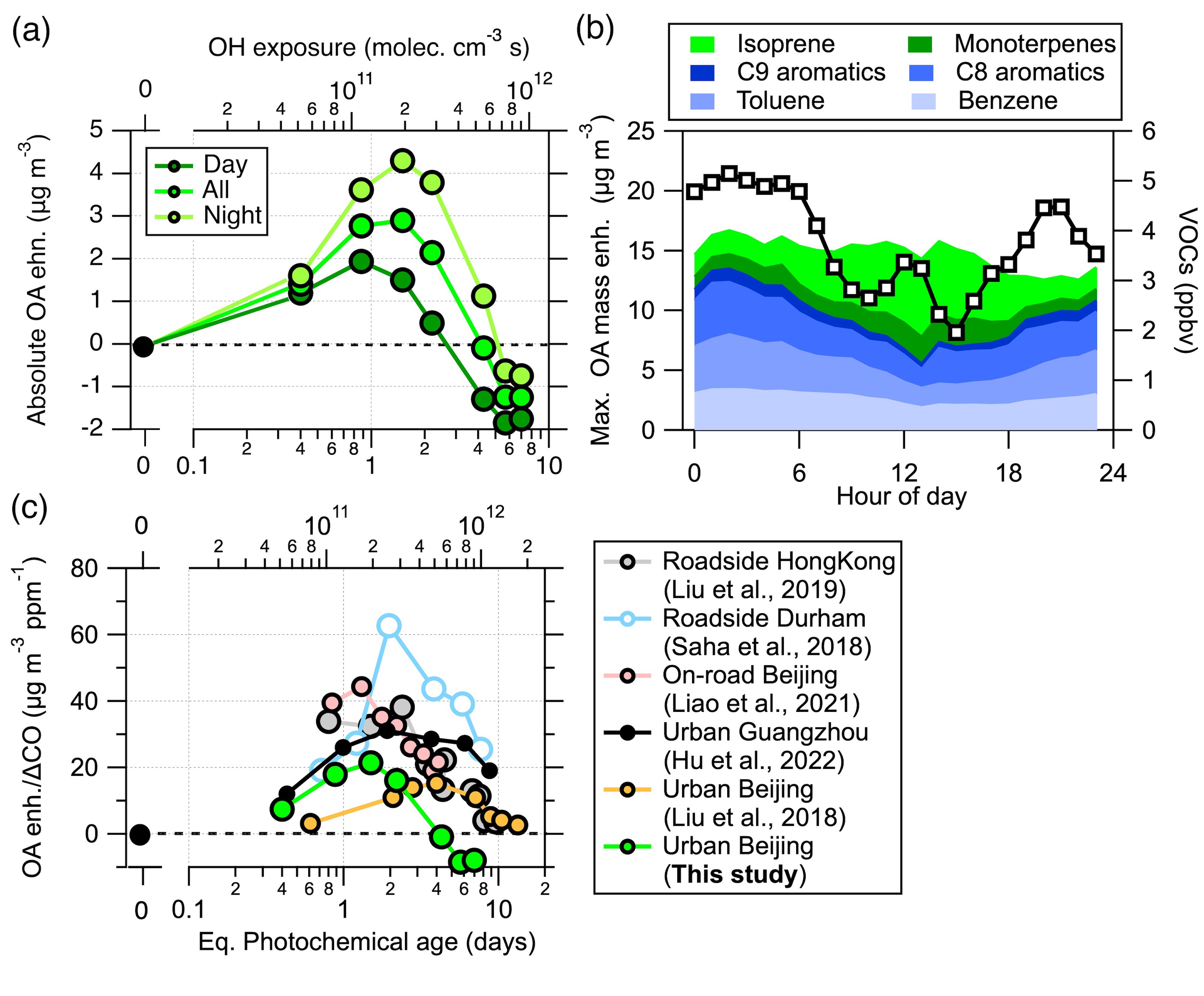 图1. (a)SOA生成潜势随OFR光化学氧化时间的变化,(b)SOA生成潜势和典型VOCs的日变化和(c)与其他地区OFR观测结果的比较。