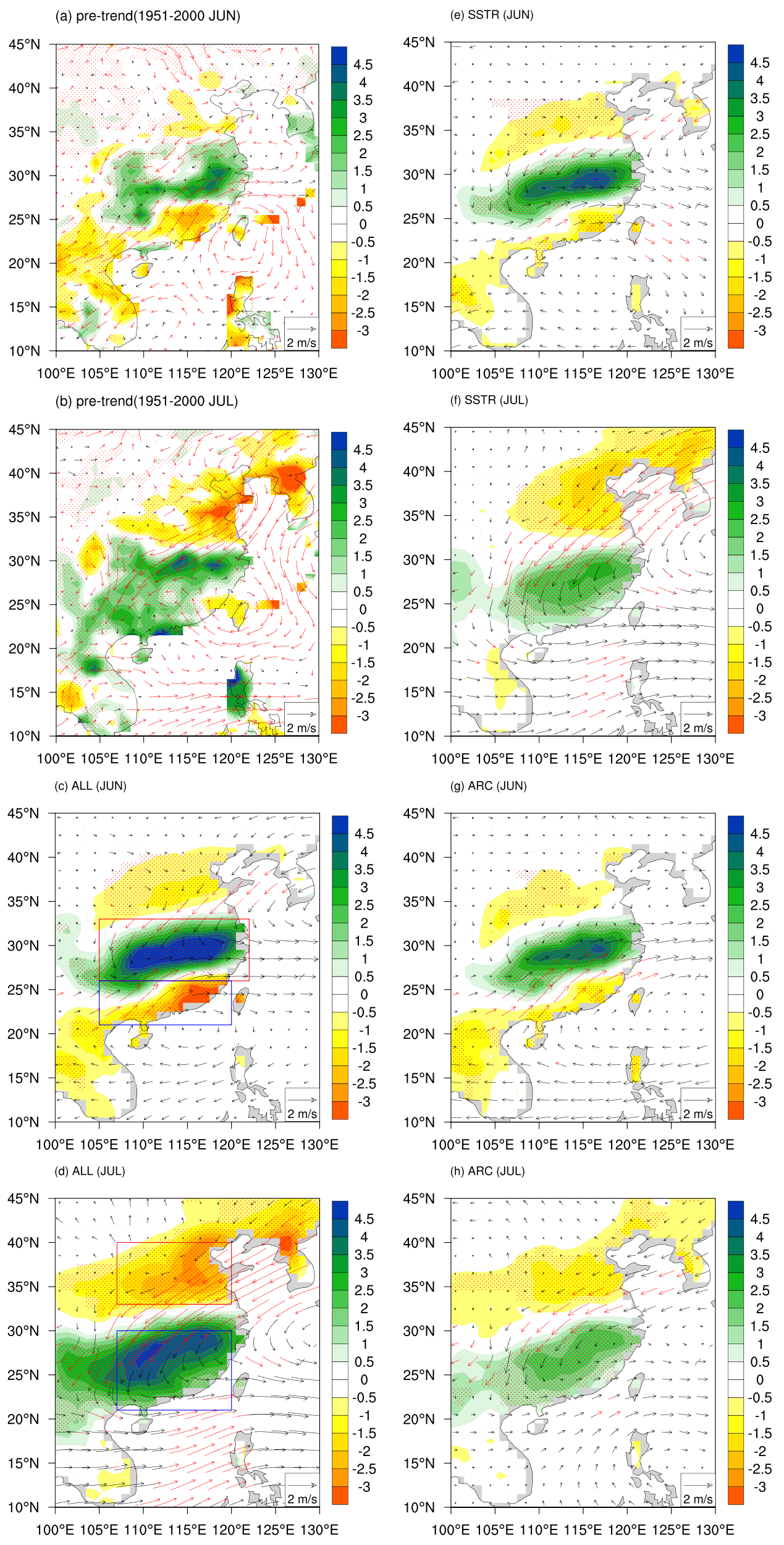 图 1. 1951-2000年GPCC/ERA5 在6月(a)和7月(b)的降水(阴影,单位:mm day-1)和850 hPa风(矢量,单位:m s-1)趋势。6月(c)和7月(d)降水(阴影,单位:mm day-1)和850 hPa风(矢量,单位:m s-1)对ALL的响应。6月(e)和7月(f)降水(阴影,单位:mm day-1)和850 hPa风(矢量,单位:m s-1)对SSTR的响应。6月(g)和7月(h)降水(阴影,单位:mm day-1)和850 hPa风(矢量,单位:m s-1)对ARC的响应。