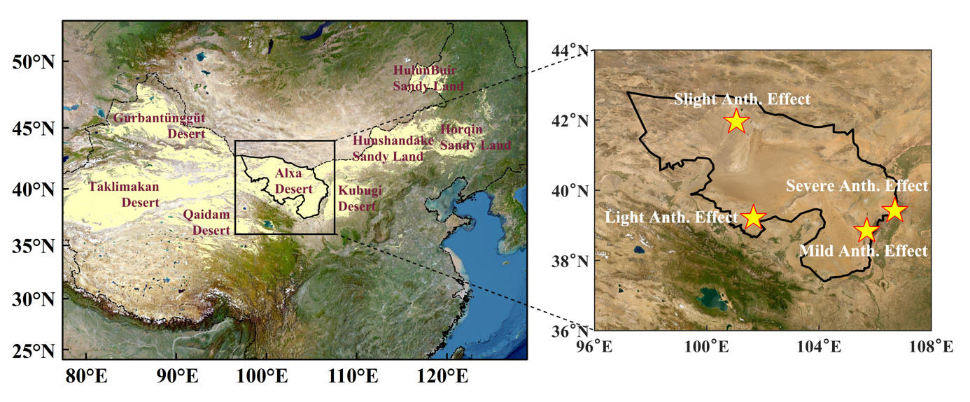 图1. 阿拉善沙漠的地理位置和观测站点(黄色阴影区域为中国沙漠分布)