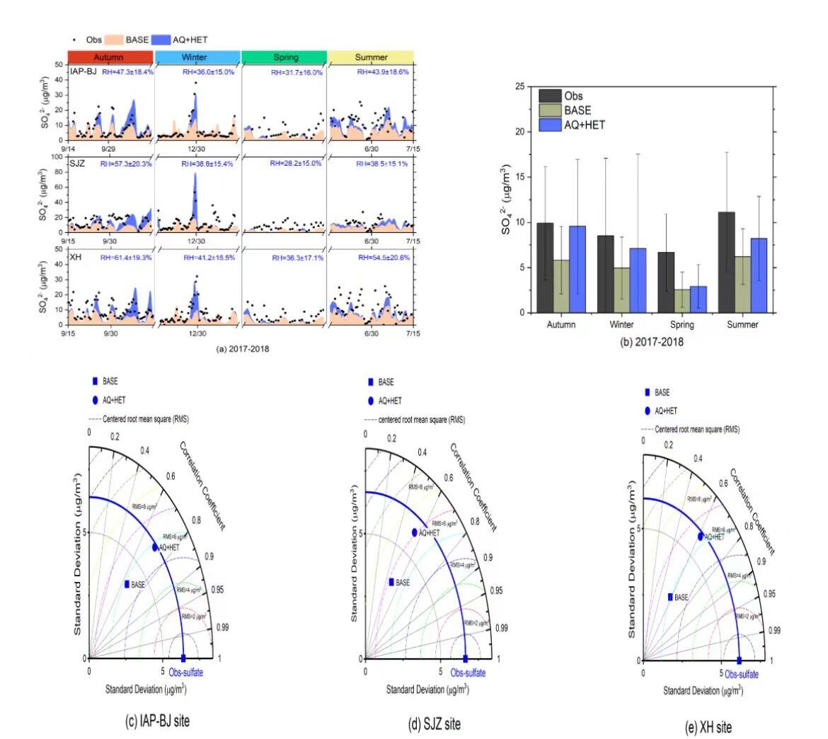 1、常见多相反应的引入明显缩小了SO42−模拟结果与观测结果之间的差距(图1),这是由于在秋、冬、夏三季的高湿度条件有助于PM2.5的吸湿增长并促进多相反应形成SO42−。