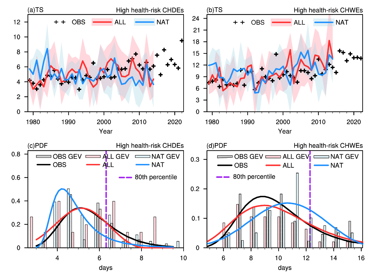 图2 人类活动对中国高健康风险CHDEs和CHWEs的影响。a, b:在中国的暖季(5月至9月)期间,高健康风险a)CHDEs和b)CHWEs的发生频率时间序列。黑色标记表示观测值(OBS;1979-2022年;单位:天),红线表示全强迫模拟结果(ALL;1979-2014年),蓝线表示自然强迫模拟结果(NAT;1979-2014年)。彩色实线表示10个模型的多模型集合结果,相应的阴影区域表示模型的变化范围。c, d:高健康风险c)干热事件和d)湿热事件的观测值(灰色柱状图和黑色实线)、ALL(粉色柱状图和红色实线)和NAT(浅蓝色柱状图和蓝色实线)的概率密度函数和GEV拟合的PDFs。紫色虚线表示观测数据时间序列的第80百分位数。