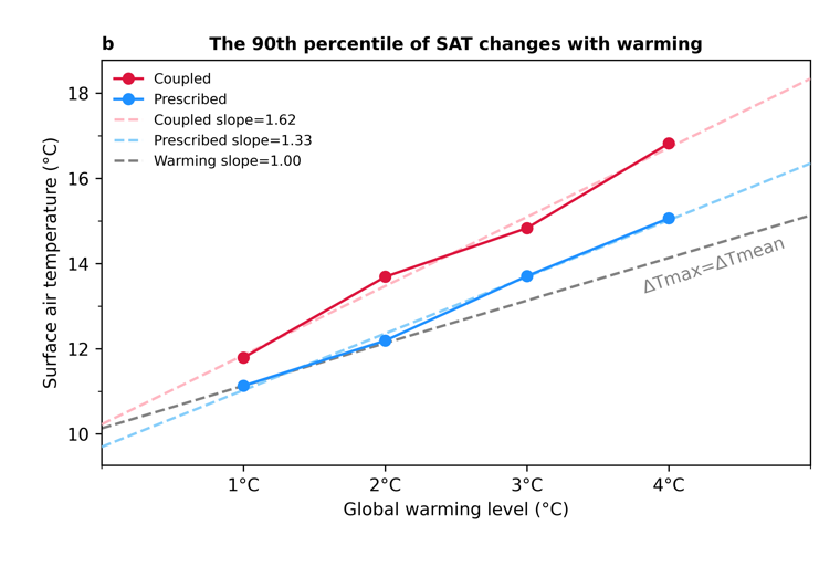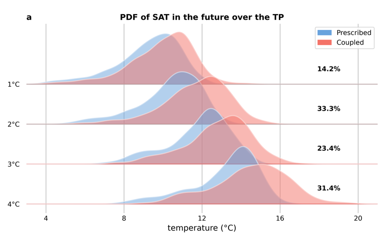 作者进一步把工作延伸到未来预估,发现陆气耦合会显著提高温度变率和极端高温事件发生的概率。在全球增暖的背景下,没有陆气耦合情况下极端高温的升温速率只比全球增暖速率快0.33℃/℃,而在存在陆气耦合情况下,极端高温的升温速率比全球增暖速率快0.62℃/℃。因此,在气候变化导致极端温度增速快于全球平均温度增速的背景下,陆气耦合还会使青藏高原极端高温的增速再增加一倍。