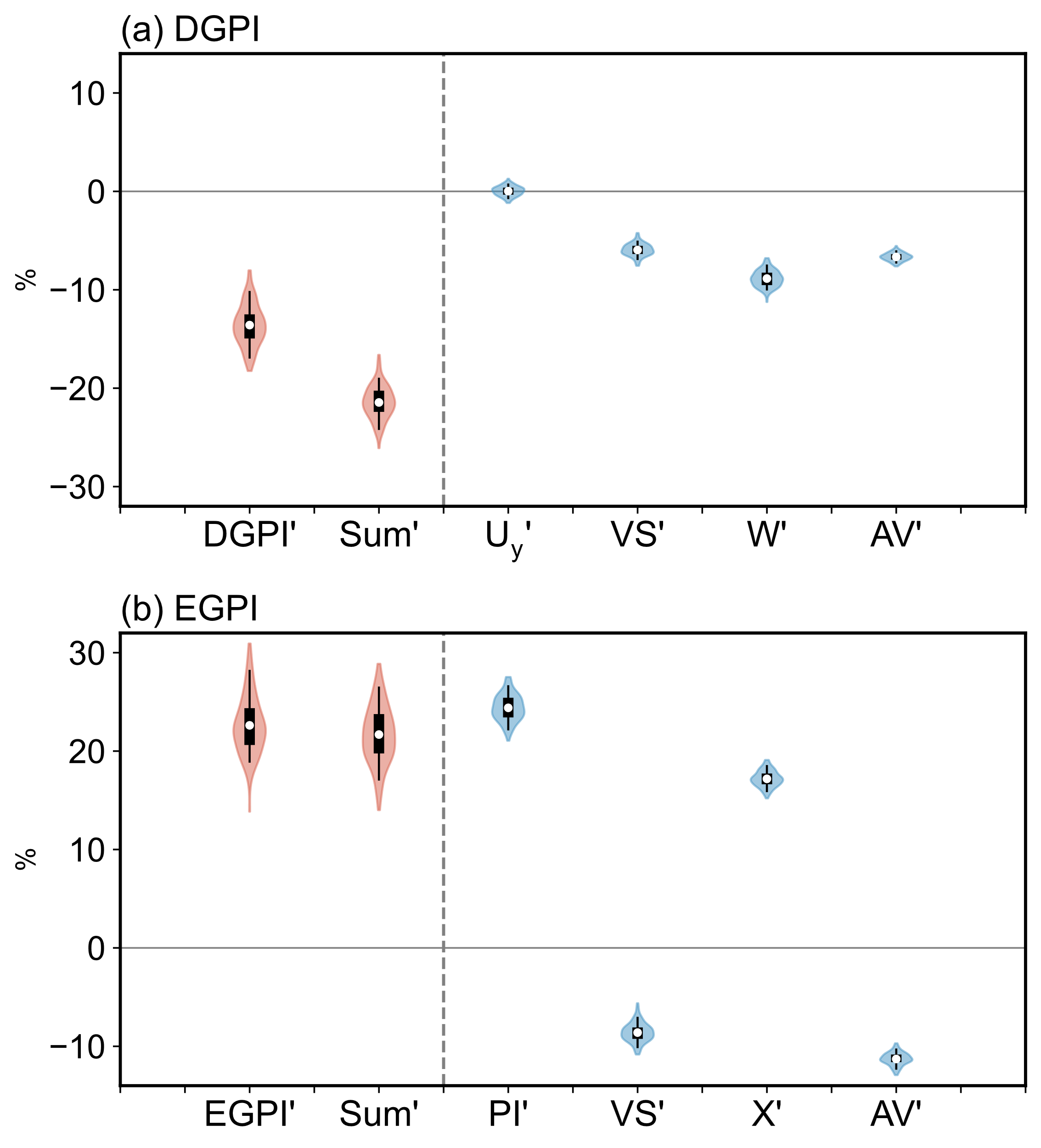 图1 (a-b) FGOALS-g3 大集合与 ERA5 之间的年均DGPI (a)和EGPI (b)的差异,以及1980年至2014年期间在西北太平洋(WNP)的相应动力项和热力项。单位:%。白色圆圈表示均值,黑色矩形表示下四分位数和上四分位数之间的范围,垂直线表示集合成员中的第5至第95百分位数范围。